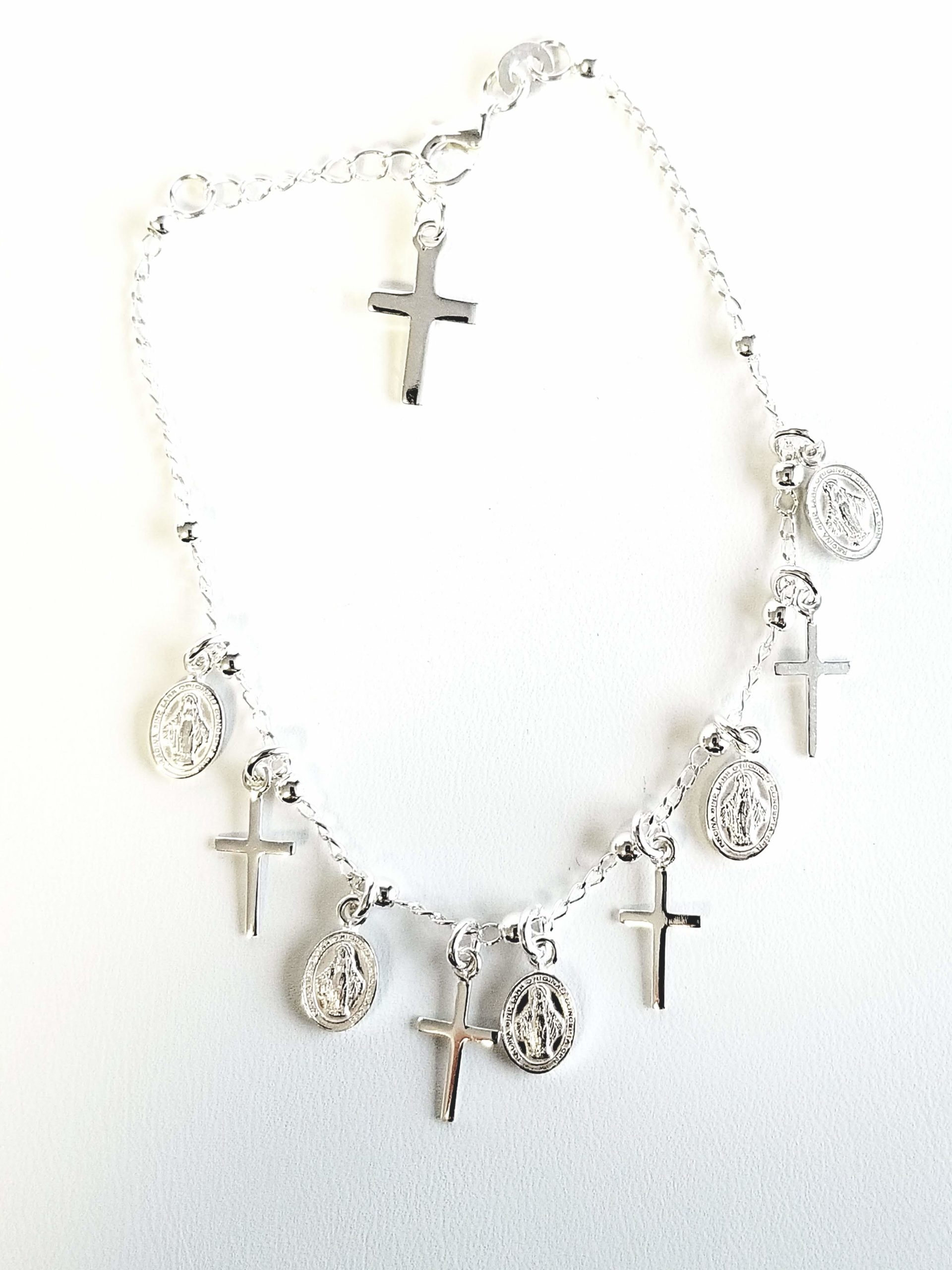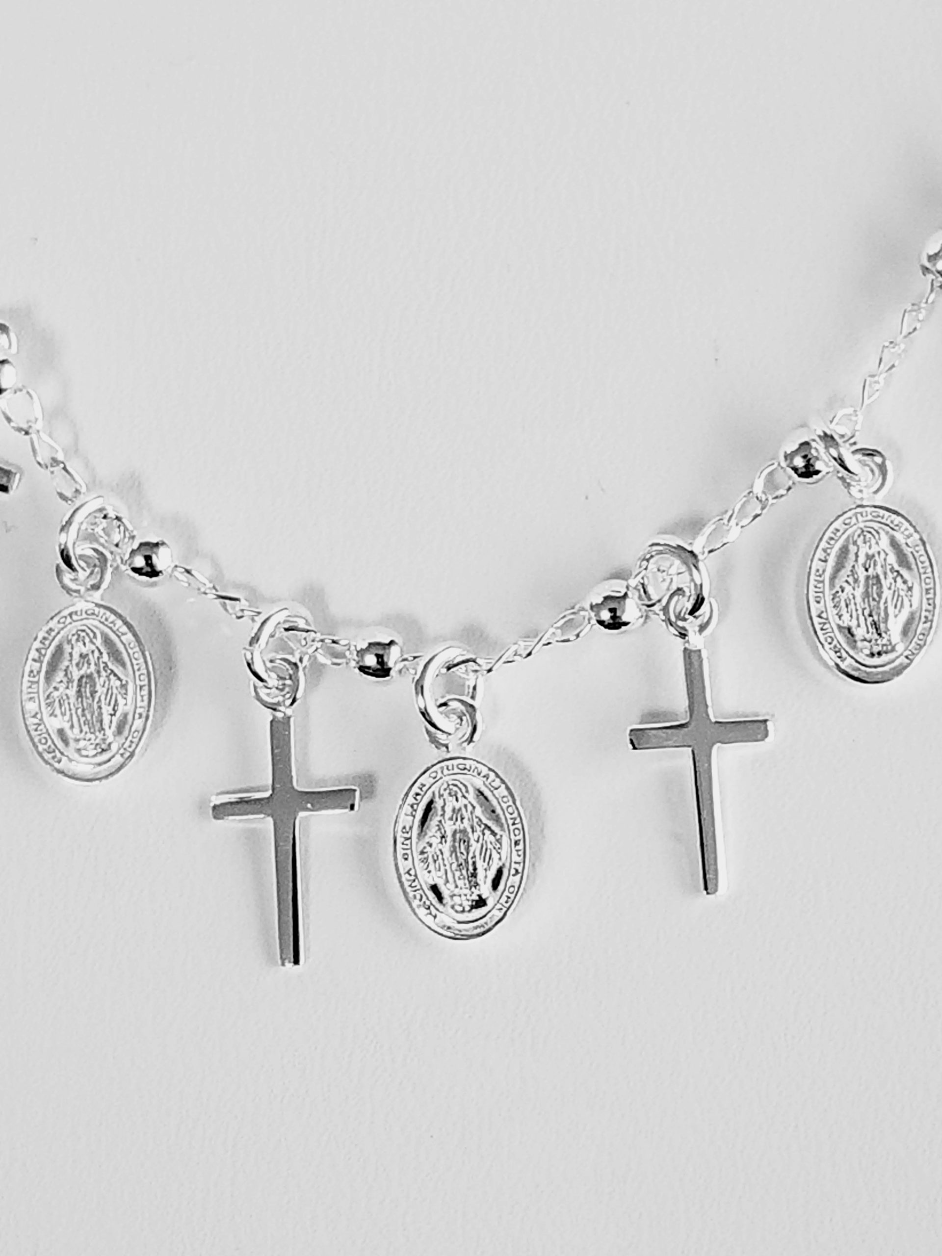 Details: Sterling Silver, 8 x 6 mm , 6 x10 mm Cross charm bracelet, 6″+1″ extension.  Sterling Silver, Rosary bracelet with oval link chain, 3 mm ball bead
